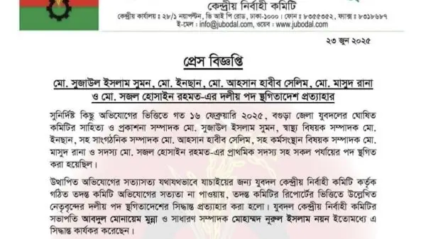 বগুড়াঃ বগুড়া জেলা যুবদলের পাঁচ নেতার ওপর আরোপিত দলীয় পদ স্থগিতাদেশ প্রত্যাহার করেছে কেন্দ্রীয় যুবদল। অভিযোগের ভিত্তিতে গঠিত তদন্ত কমিটির প্রতিবেদনে অভিযুক্তদের বিরুদ্ধে আনা অভিযোগের সত্যতা না পাওয়ায় এই সিদ্ধান্ত